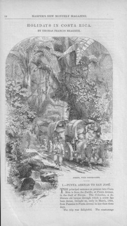 Our link to a scan of an article written by the first "tourist in Costa Rica" in 1858 - Thomas Francis Meagher. But Meagher was no ordinary tourist. He was in fact a leader of the 1848 Irish uprising and had been sentenced to death but commuted to penal colony for life in Tasmania and escaped to become a New York lawyer and writer for Harpers Magazine.